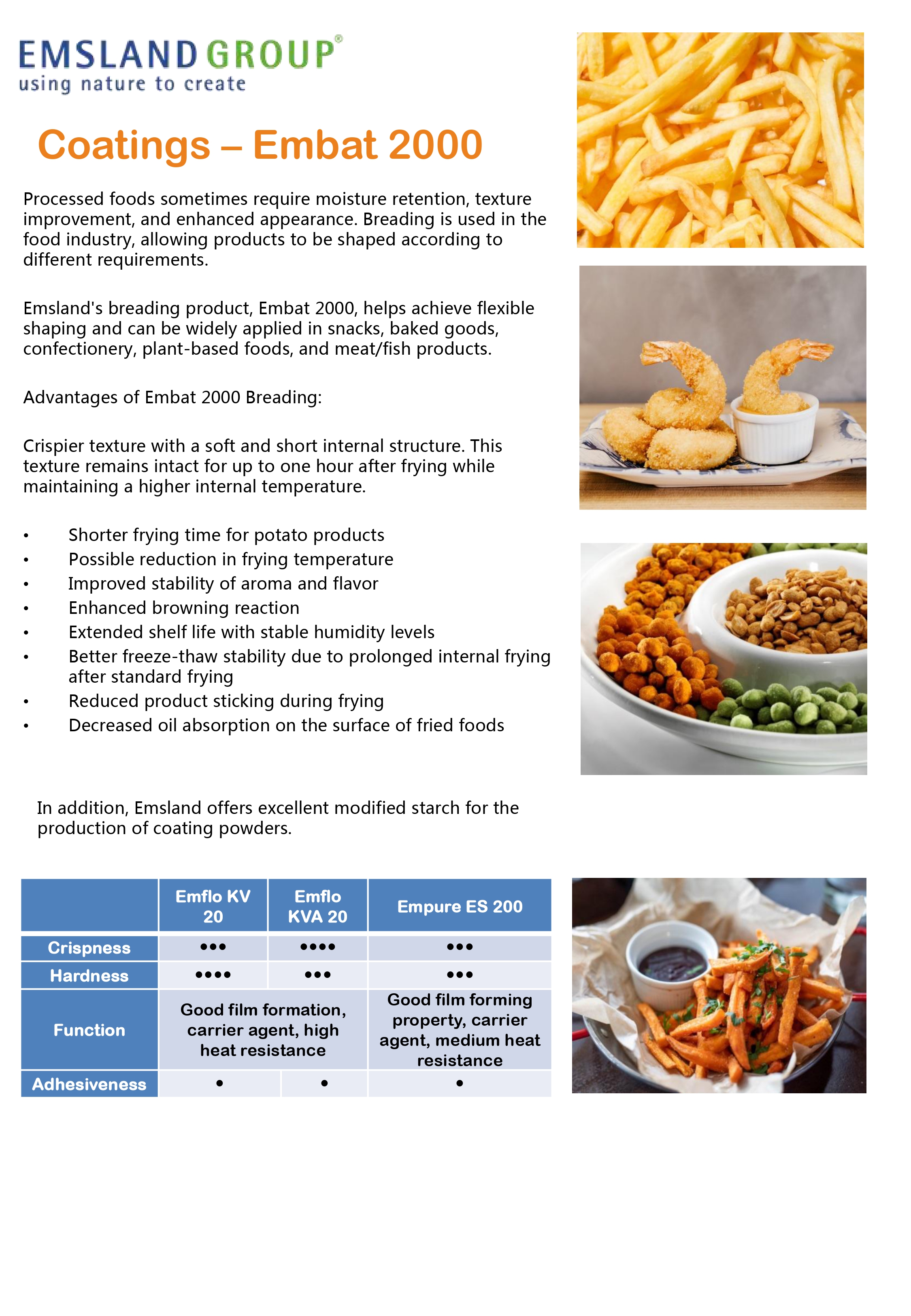 Processed foods often require moistu♥re retention, texture stabilization, and improved appearance. Breading not only achieveδs these effects but aσlso enhances flavor and mouthfe↓el. Our breading ingredients, such as starch and dextrin, improve product form®ability and transparency. They deliver excellent performance and taste in a↓pplications like frozen French ≥fries, tempura, confectionery•, baked goods, fried meat products, and fried seafood.