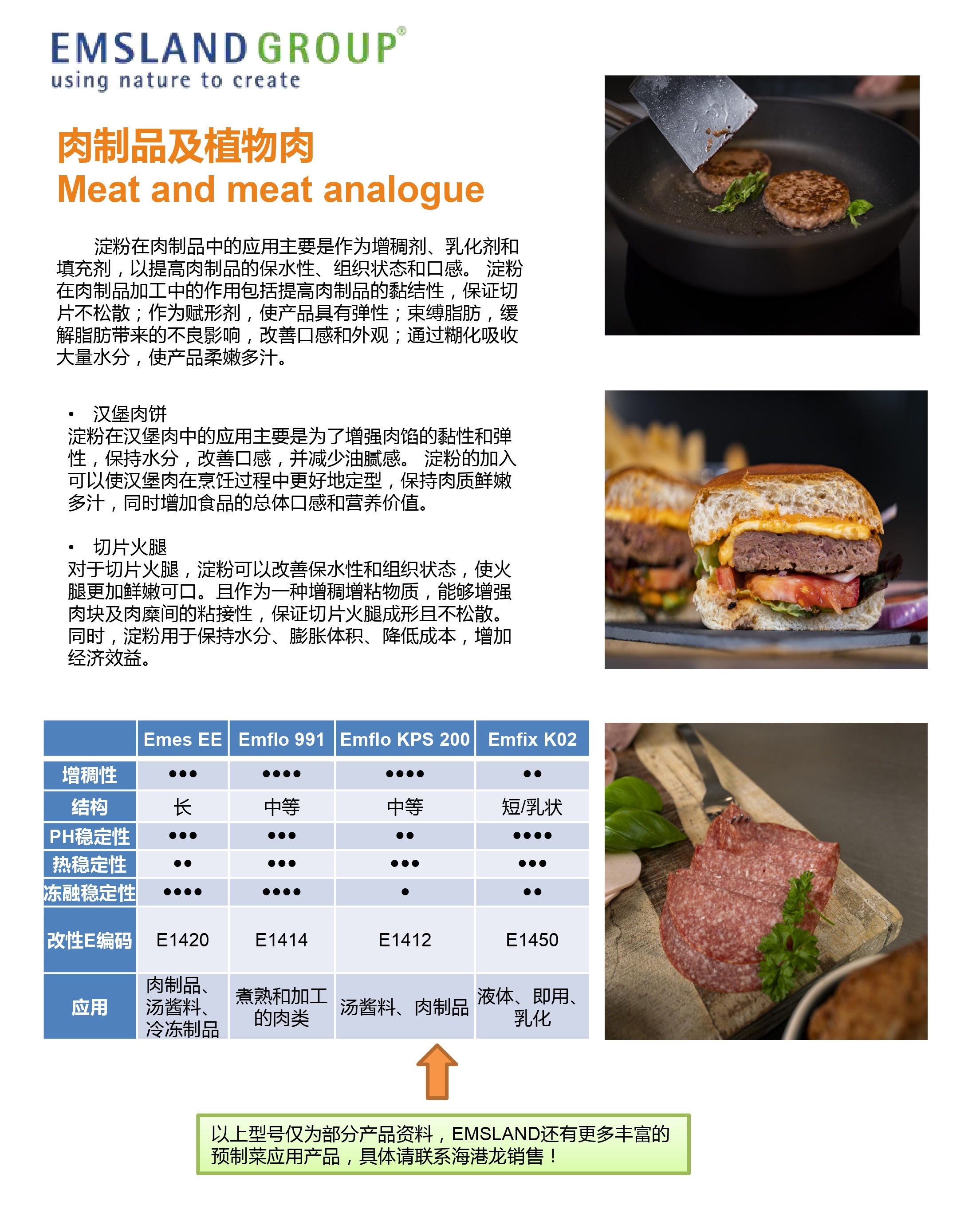 肉制(zhì)品的(de)食用(yòng)品質主要(yào)包括肉的(de)顔色,持水(shuǐ)性,黏和(hé)性和(♠hé)嫩度等方面。EMSLAND的(de) 澱粉具有(yǒu)高(gāo)效的(de)功能(néng)性和(hé)水(shuǐ)融性,是(shì)加工(gōng)肉制($zhì)品的(de)理(lǐ)想選擇。澱粉主要(yào)作(zuò)為(wèi)粘合劑和(hé)組織改良 劑鎖水(shuǐ),改善産品質地(dì),使肉質更加鮮美(měi)多(←duō)汁适口,增加出品率。
