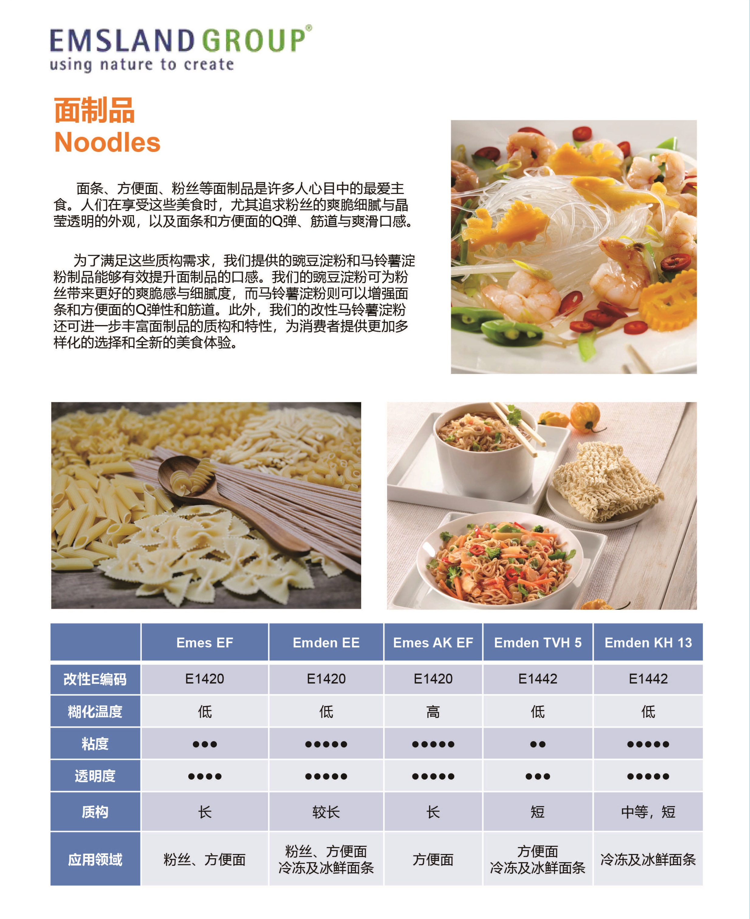 意大(dà)利面、面條、粉絲等面制(zhì)品是(shì)全世界最大(dà)主食之一(yī),方便、營養切健康因此銷量巨大¶(dà)。其中中國(guó),是(shì)世界上(shàng)最大(dà)的(de)方便面☆消費(fèi)國(guó),每年(nián)對(duì)于澱粉的(de)需求量增加10%€。我們有(yǒu)廣泛的(de)産品如(rú)馬鈴薯澱粉、豌豆澱粉、木(mù)薯澱粉、小(xiǎo)≠麥澱粉、改性澱粉、纖維和(hé)全粉等産品可(kě)用(yòng)于不(bù)同的(d♠e)面制(zhì)品中,提升質構和(hé)口感、延長(cháng)貨架保質期、豐富營養等。